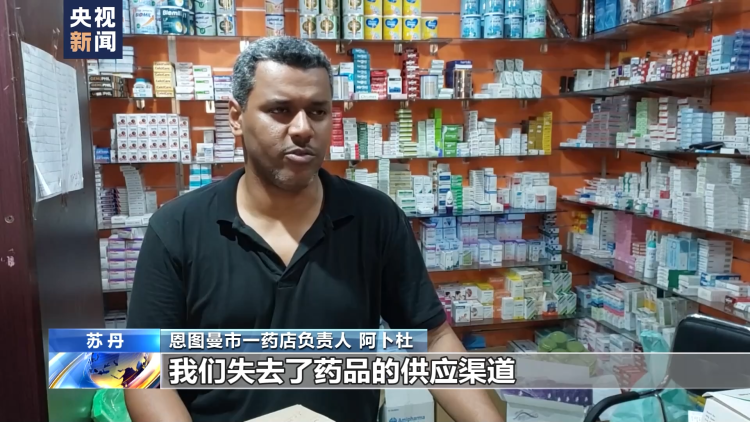 恩图曼市一药店负责人 阿卜杜:我们失去了药品的供应渠道,现在货架上的药品就是我们所有的库存。实际上,几乎所有的日常药品都很紧缺。