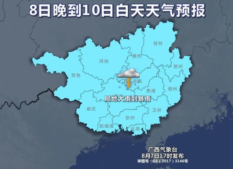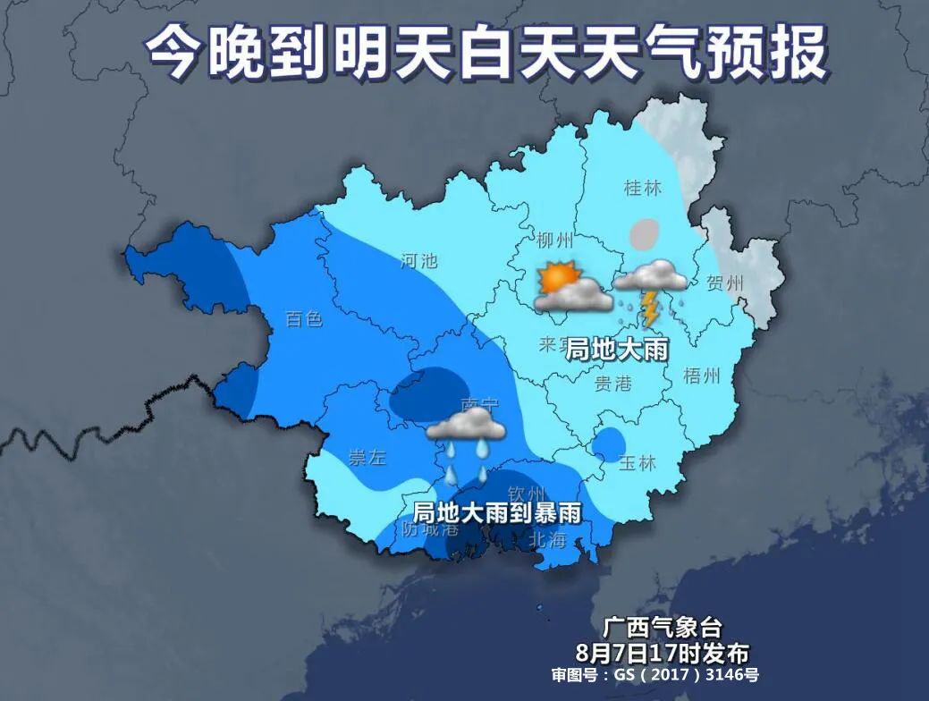 7日晚上到8日白天,百色、河池、崇左、防城港、钦州、北海、南宁等市的部分地区有中雨、局地大雨到暴雨,我区其他地区多云有阵雨或雷雨、局地大雨。
