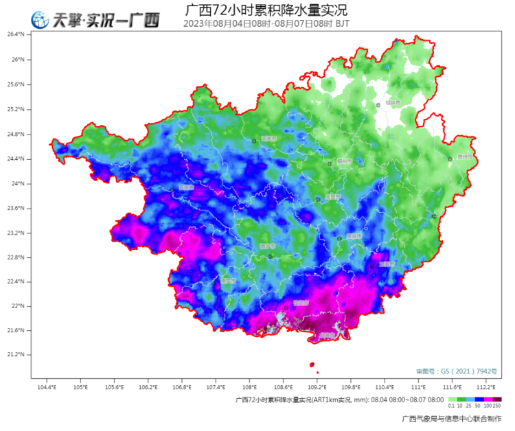 据统计,8月3日20时~7日8时,雨量最大出现在防城港市防城区江山镇408毫米;北部湾海面及桂东南、沿海局地出现7~9级大风,最大为北部湾石油平台25.2米/秒(10级)。