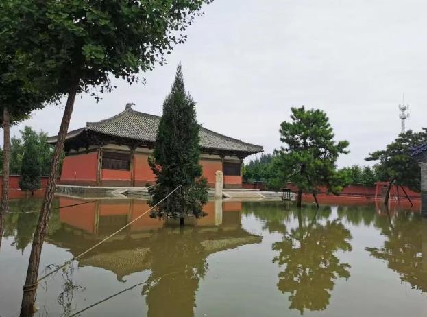 目前开善寺院内洪水水位缓慢回落中,已经露出大雄宝殿台明。