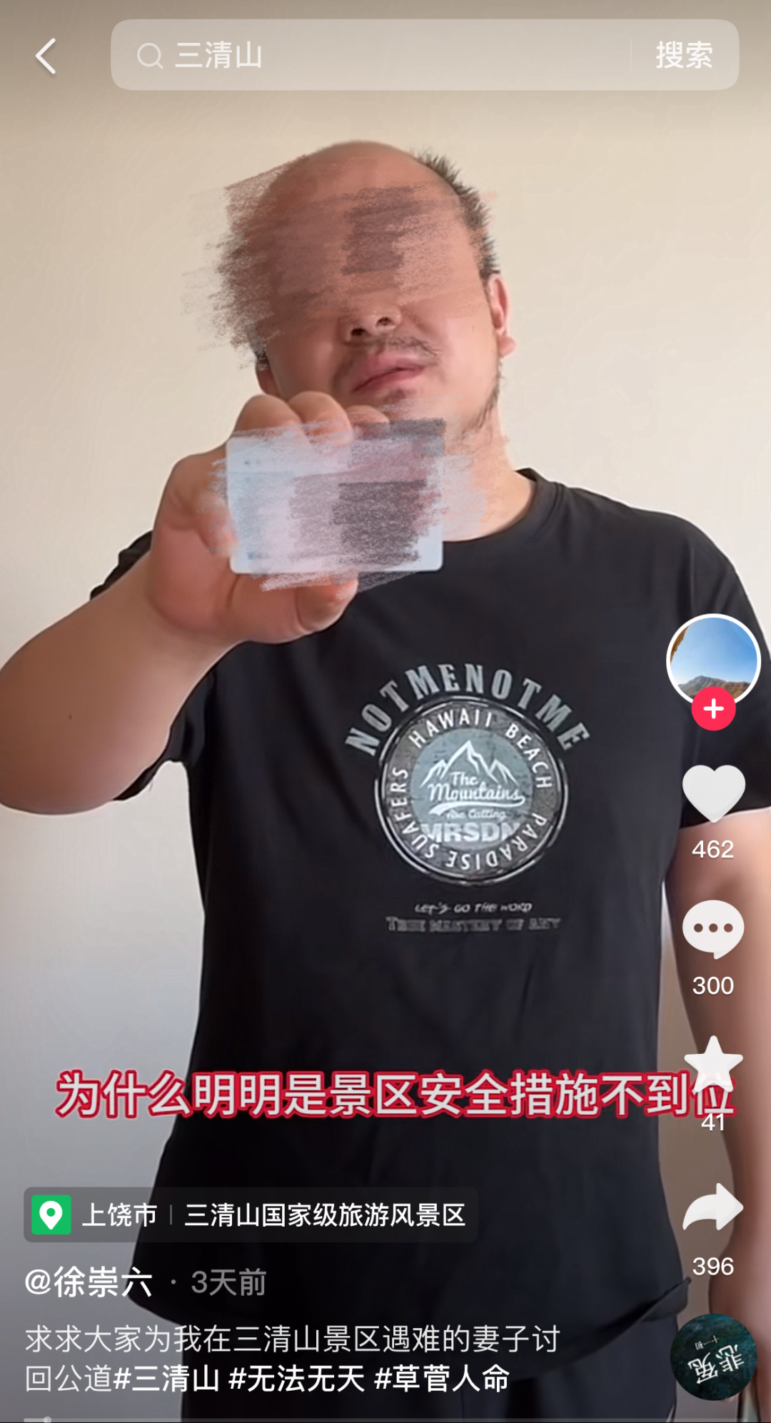 近日,网友徐先生实名举报称,江西三清山国家级旅游风景区因安全措施未做到位,致妻子被山洪卷走,不幸身亡。由于家中还有一对6岁及3岁的幼子,且双方父母需要赡养,徐先生经过法律咨询,希望景区赔付260万。据媒体报道,景区方面测算出来的赔付费用是160万元,并只愿意赔付3成,约为60万元。徐先生认为景区在逃避责任,三清山风景名胜管理局对此事拒绝回应,表示一切以通报为准。