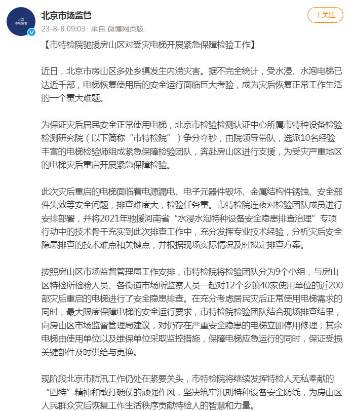 为保证灾后居民安全正常使用电梯,北京市检验检测认证中心所属市特种设备检验检测研究院(以下简称“市特检院”)争分夺秒,由院领导带队,选派10名经验丰富的电梯检验师组成紧急保障检验团队,奔赴房山区进行支援,为受灾严重地区的电梯灾后重启开展紧急保障检验。