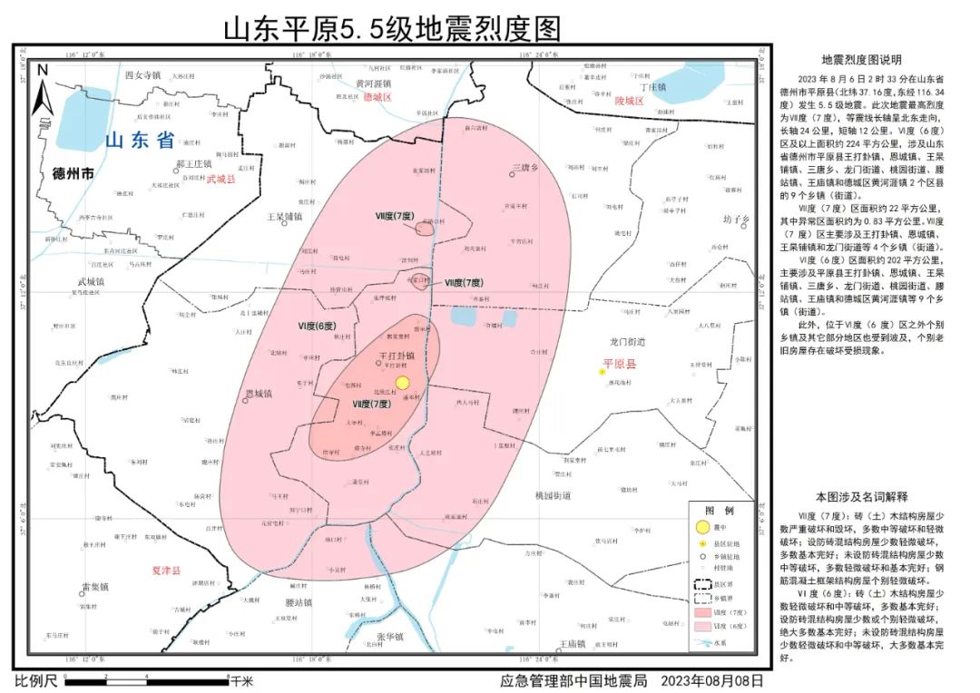 2023年8月6日2时33分,山东省德州市平原县发生5.5级地震。震后,按照应急管理部部署,中国地震局组织山东省地震局开展应急处置工作,依照《地震现场工作 第3部分:调查规范》(GB/T 18208.3-2011)、《中国地震烈度表》(GB/T 17742-2020),通过灾区震害调查,并综合应用仪器烈度、地震构造背景、余震分布、震源机制等科技支撑成果,确定了此次地震的烈度分布,并依照《地震烈度图制图规范》(GB/T 38226-2019)编制完成《山东平原5.5级地震烈度图》。