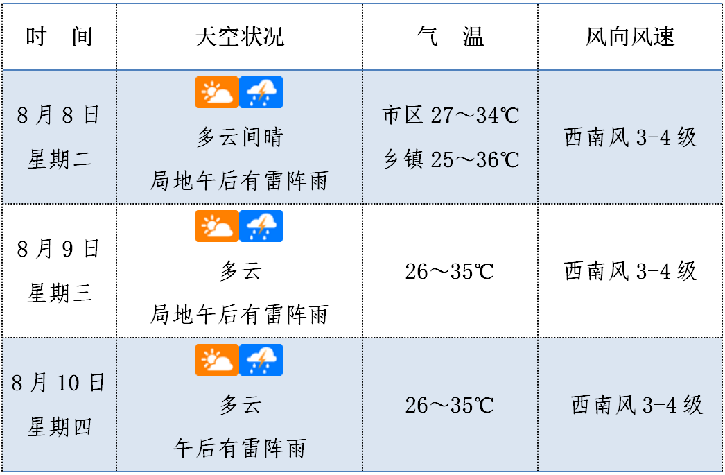 海口市气象台8月8日8时发布未来3天天气预报:
