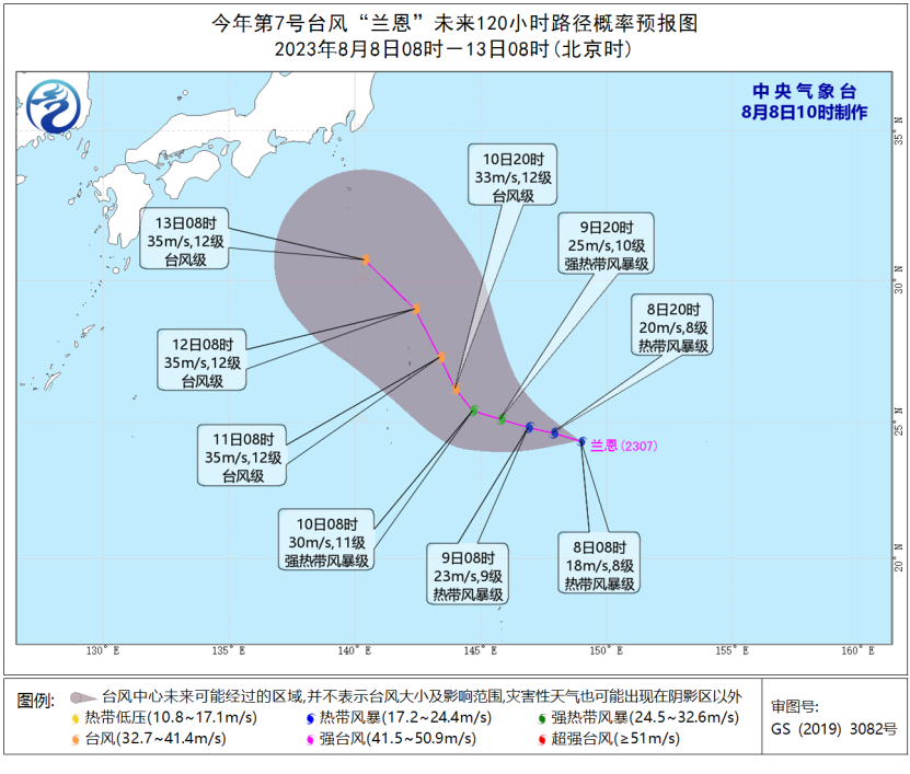 今年第7号台风“兰恩”(热带风暴级;英文名称:Lan;名字来源:美国;名称意义:风暴(马绍尔语))于8月8日上午在西北太平洋洋面生成,上午8点钟其中心位于日本神奈川县横滨市东南方向约1530公里的洋面上,北纬24.3度、东经149.0度, 8级(18米/秒),998百帕,七级风圈半径280-380公里。预计,“兰恩”将以每小时10公里左右的速度向西偏北方向移动,强度逐渐加强。