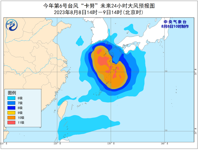 大风预报: 8月8日14时至9日14时,巴士海峡、台湾海峡北部、台湾以东洋面、黄海南部部分海域、东海南部和东部及钓鱼岛附近海域将有6-7级、阵风8-9级的大风,其中东海东部部分海域风力可达8-10级,阵风11-12级,“卡努”中心经过的附近海域风力可达11-12级,阵风13-14级。