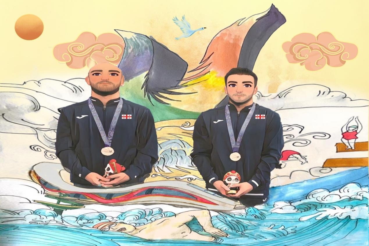 格鲁吉亚跳水运动员奥尼卡什维利(右)和梅利基泽(左)在男子双人3米跳板决赛获得铜牌,激动地说:“中国观众也在为我们这些外国运动员加油,我们感觉真的很棒。”