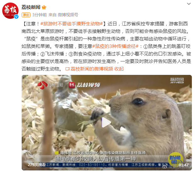近日,江苏省疾控专家提醒,游客到西南西北大草原旅游时,不要徒手去接触野生动物,否则可能会有感染鼠疫的风险。“鼠疫”是由鼠疫杆菌引起的一种急性烈性传染病,主要在啮齿动物中循环进行,如鼠类和旱獭。专家提醒,要注意鼠疫的3种传播途径:①鼠类身上的跳蚤叮咬后传播;②飞沫传播;③剥食染疫动物,通过手上细小看不见的伤口引发感染。被感染的主要症状是高热,若在旅游时发生高热,一定要及时就诊并告知医务人员是否触碰过野生动物。