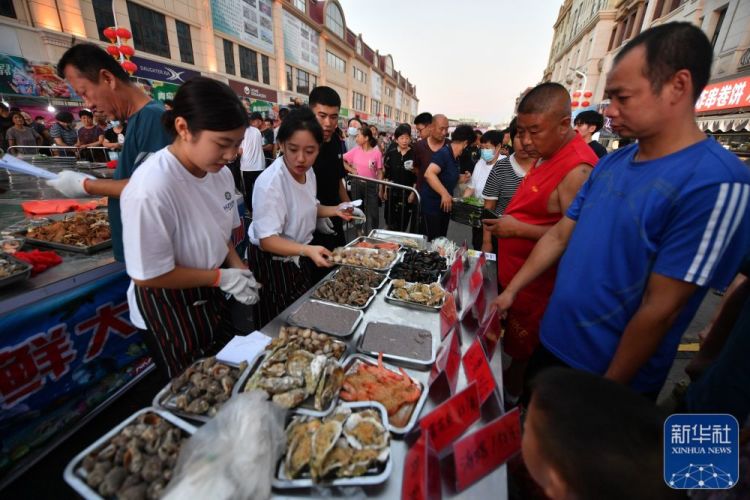 8月6日晚,在山东省青岛市城阳区举行的首届青岛国际海鲜节活动上,游客在选购各式海鲜。新华社发(王海滨 摄)