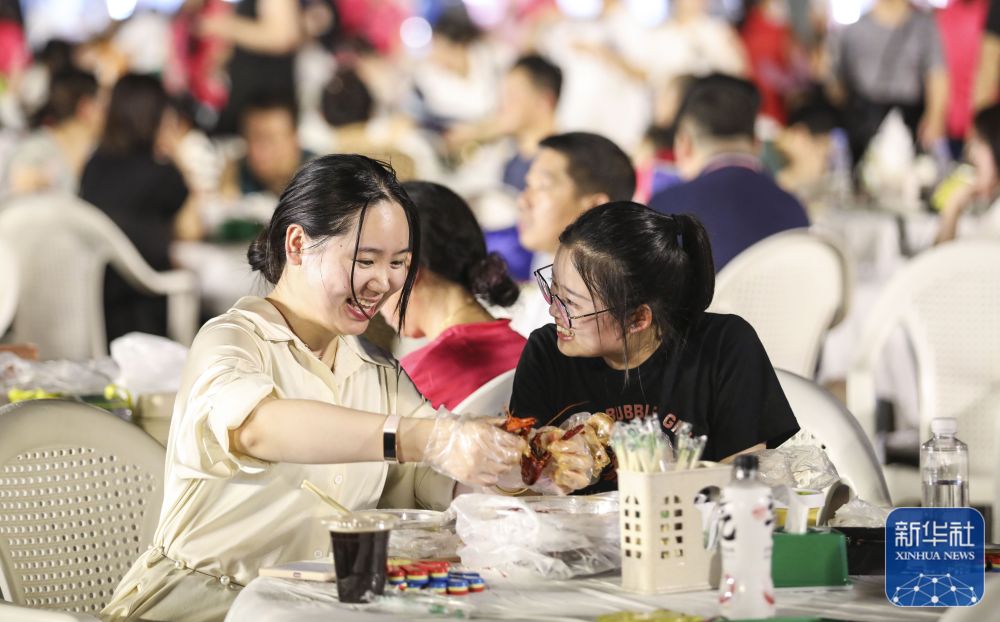 8月4日晚,在江苏省淮安市,市民在“一虾两园 嗨游淮安”夏夜消费节上品尝美食。新华社发(赵启瑞 摄)