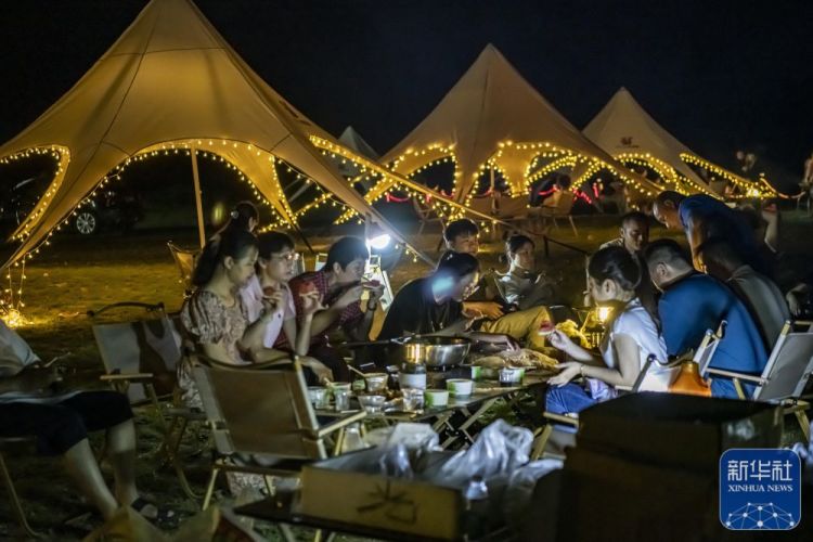 8月8日,在海南省琼海市龙江镇南正村,市民和游客在万泉河畔露营纳凉。新华社发(蒙钟德 摄)