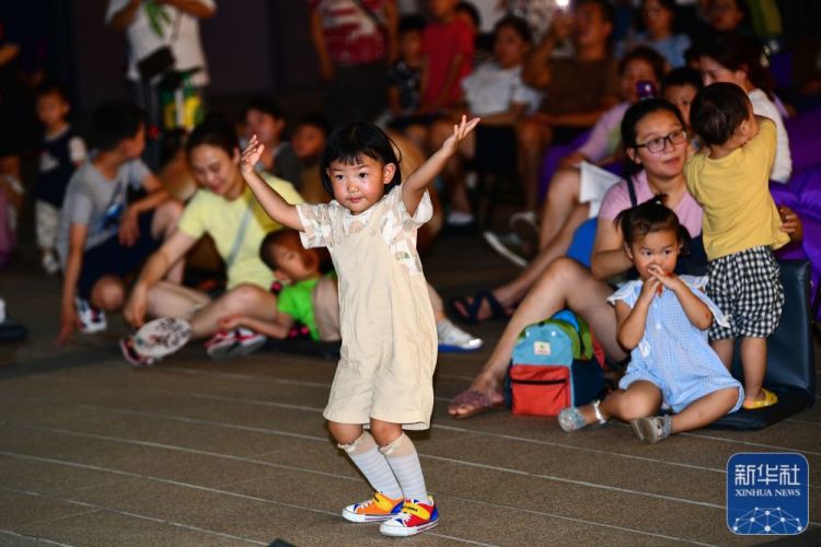 8月4日晚,在南京玄武湖畔“遇见夜金陵湖畔音乐汇”现场,一名小朋友随音乐起舞。新华社发(王跃武 摄)