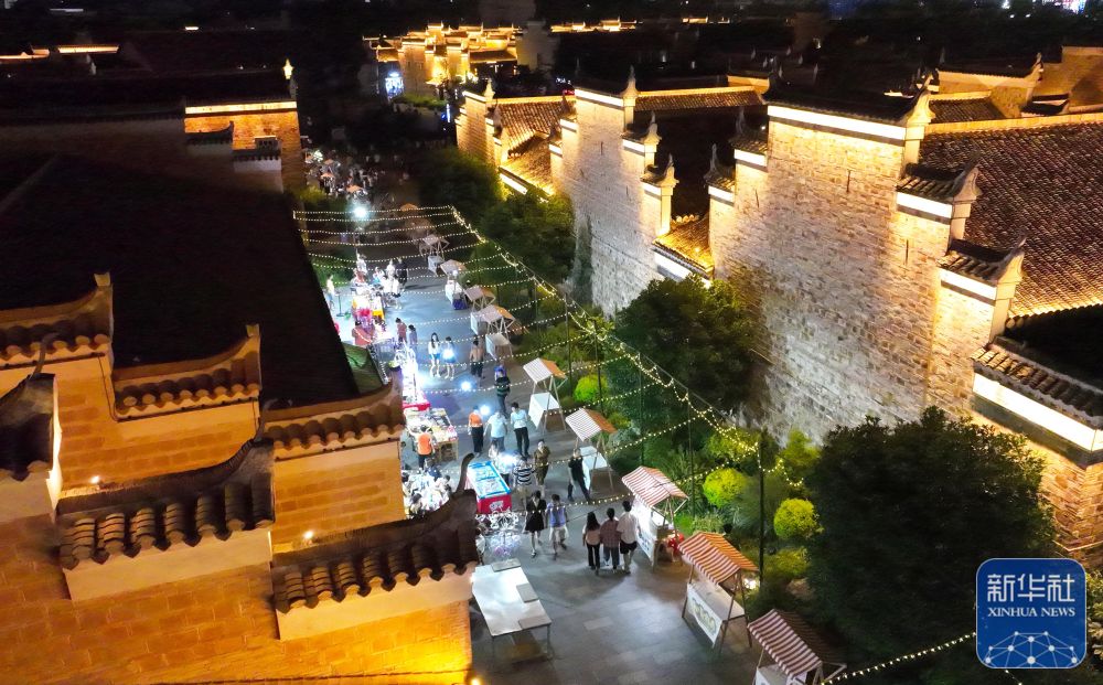 8月7日晚,江西省宜春市万载古城景区内灯光璀璨,热闹非凡,市民和游客在这里品美食、赏花灯、逛市集、观戏曲表演。新华社发(邓龙华 摄)