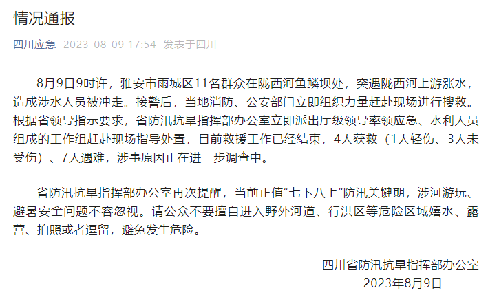 8月9日9时许,雅安市雨城区11名群众在陇西河鱼鳞坝处,突遇陇西河上游涨水,造成涉水人员被冲走。接警后,当地消防、公安部门立即组织力量赶赴现场进行搜救。根据省领导指示要求,省防汛抗旱指挥部办公室立即派出厅级领导率领应急、水利人员组成的工作组赶赴现场指导处置,目前救援工作已经结束,4人获救(1人轻伤、3人未受伤)、7人遇难,涉事原因正在进一步调查中。