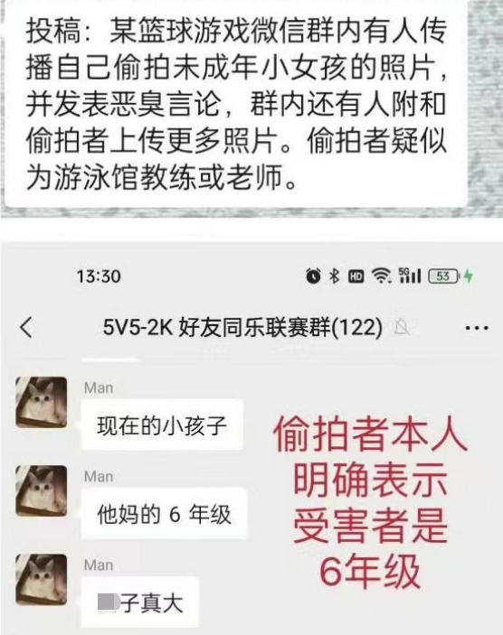 网传图片中,一名男子称小学6年级的小孩子胸部很大,“现在的小孩子,**六年级,**真大”。在之后的聊天中,群内有多人起哄,他便分享了一张疑似偷拍的6年级女学生图片。