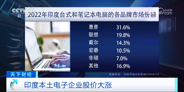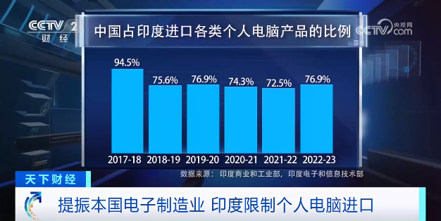全球分析公司Counterpoint的数据显示,印度大约65%的笔记本电脑等个人电脑产品依赖进口。而在这些进口中,中国所占的比例很大,2022年到2023年,中国占到印度进口的各类个人电脑产品的大约76.9%。