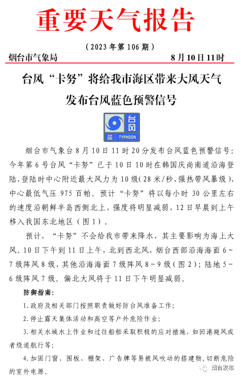 预计,“卡努”不会给我市带来降水,其主要影响为海上大风10日下午到11日上午,北到西北风,烟台西部沿海海面6~7级阵风8级,其他沿海海面7级阵风8~9级;陆地5~6级阵风7级。偏北大风将于11日下午明显减弱。