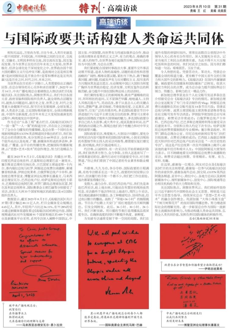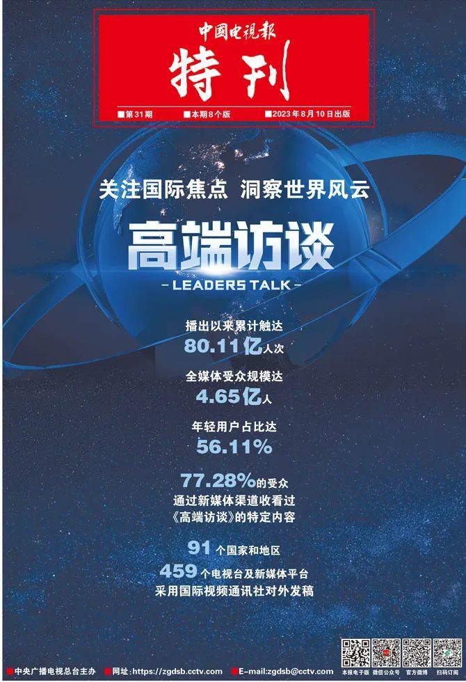 数据显示,截至2023年8月2日,《高端访谈》(共计37期)累计触达80.11亿人次。栏目全媒体受众规模达4.65亿人。其中,年轻用户占比达56.11%,有77.28%的受众通过新媒体渠道收看过《高端访谈》的特定内容。国际视频通讯社对外发稿被91个国家和地区的459个电视台及新媒体平台采用。系列专访深入阐释中国倡议、中国主张、中国智慧,向世界有力传递加强多边合作、推动全球治理体系变革的正义之声。有力的观点、准确的事实、感人的细节,在世界各地引起强烈反响,国际社会纷纷为中国点赞、为总台点赞。