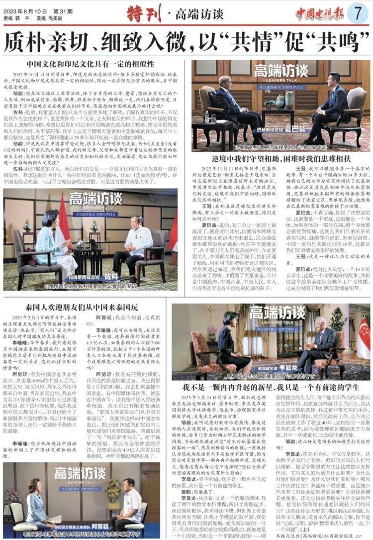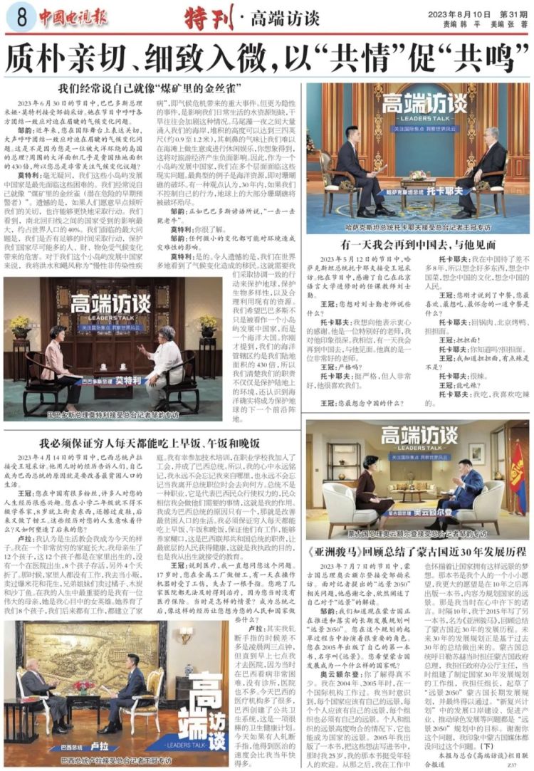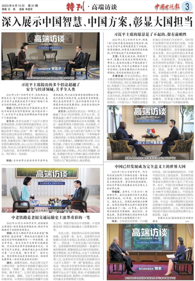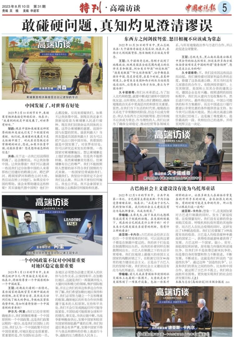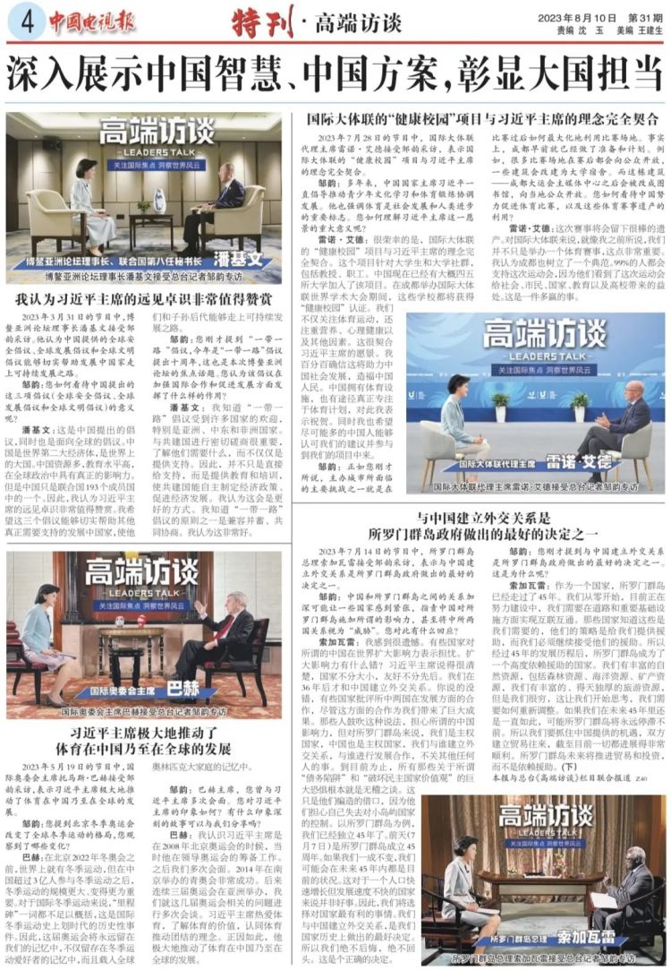 8月10日,总台《中国电视报》推出《高端访谈》特刊,围绕“深入展示中国智慧、中国方案,彰显大国担当”“敢碰硬问题,真知灼见澄清谬误”“质朴亲切、细致入微,以‘共情’促‘共鸣’”三大主题,回顾30多期节目中的精彩对话、精到互动。特刊由《高端访谈》栏目组撰写开篇文章,深入阐述节目开播以来的总结和思考,全文如下: