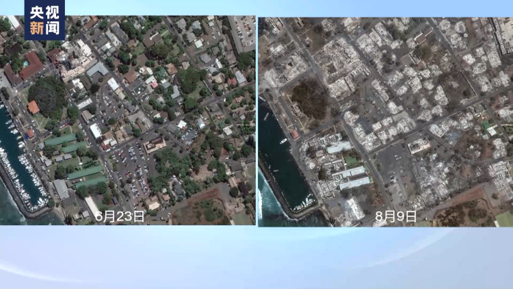 在这组卫星图中,左边为拉海纳今年6月23日的卫星图,右边为8月9日的卫星图,对比图显示,该镇几乎所有房屋都变为废墟,城镇中的树木、绿植被大片烧毁,呈焦黑色。
