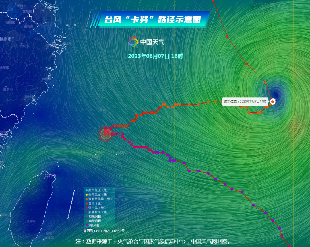 本月初,“卡努”就逐步靠近我国浙江、福建沿海,眼看着要登陆了,恰巧碰上副热带高压断裂,8月4日突然来了个100°拐弯,转向东北方向移动。