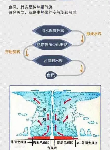 台风是一个深厚的低气压系统,如果将成熟的台风它做水平剖面,可以看到有明显不同的三个区域,从中心向外依次为:台风眼区、云墙区、螺旋雨带区。