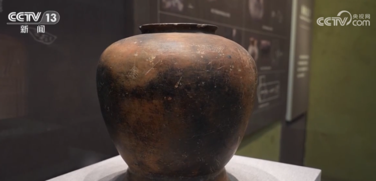 总台记者 朱睿祺: 从良渚古城出土的绝大部分文物,真品就收藏在附近的良渚博物院。在第一展厅“水乡泽国”里,我们可以通过出土文物全面了解良渚先民的衣食住行,还能看到当时最主要的生活器物——陶器。在众多黑皮陶中,这件刻符黑陶罐具有独特的研究价值,也是博物院的其中一件“镇馆之宝”。刻符黑陶罐高26.4厘米,口径12.8厘米,腹径25厘米,通俗地讲,就是脖子短、肩膀宽、肚子鼓的圆形容器。刻符黑陶罐在余杭区的南湖被发现,由于长期埋藏于水中,本身是黑陶的它,外表因水锈而呈现大块的红褐色。