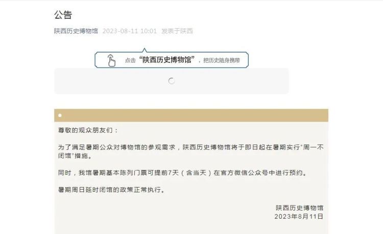 8月11日上午,陕西历史博物馆发布公告,表示“为了满足暑期公众对博物馆的参观需求,陕西历史博物馆将于即日起在暑期实行‘周一不闭馆’措施。”