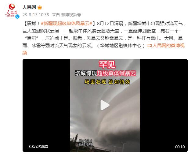 8月12日清晨,新疆塔城出现强对流天气,巨大的漩涡状云层——超级单体风暴云遮蔽天空,一直延伸到低空,宛若一个“黑洞”,压迫感十足。据悉,风暴云又称雷暴云,是一种伴有雷电、大风、暴雨、冰雹等强对流天气现象的云系。(塔城地区融媒体中心)