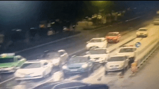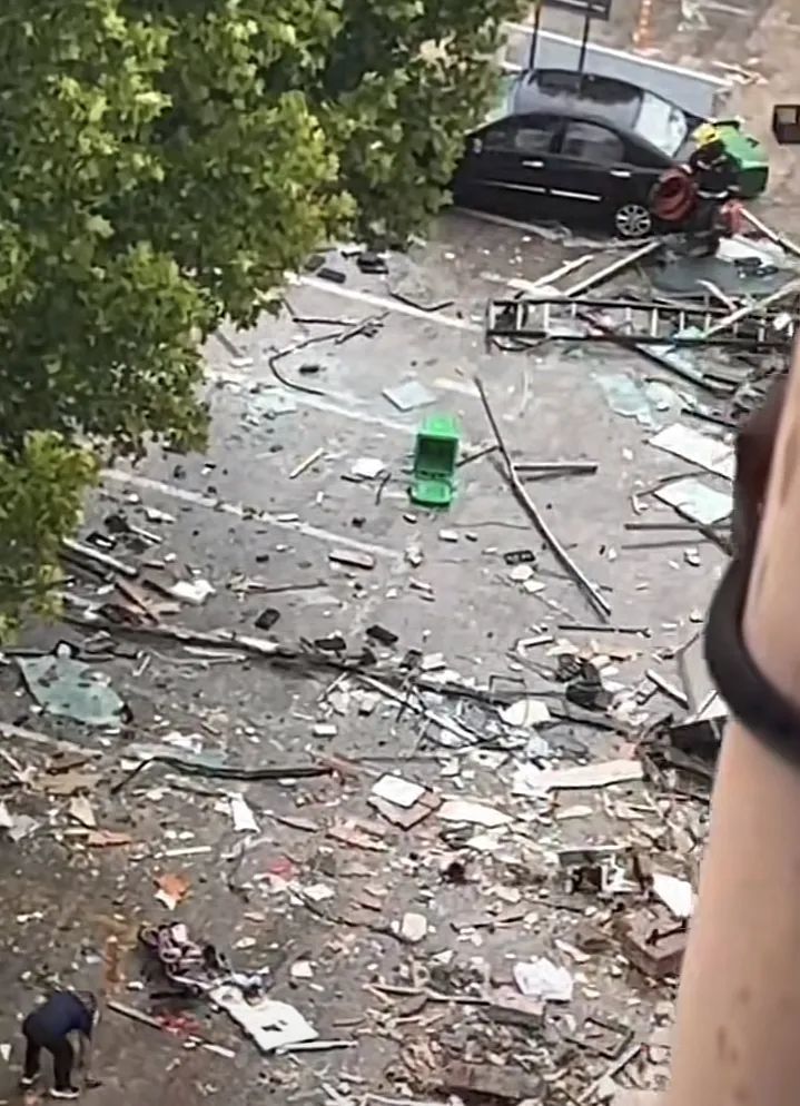 网友发布的视频显示,相邻的一家银行和一家烤鱼店,两层楼的玻璃和外墙已不见,地面一片狼藉。门口的马路也受到了影响,有人员受伤倒地,也有车辆损坏。