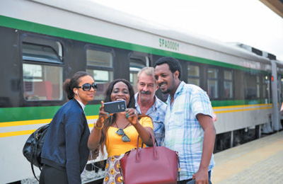 由中国土木承建的尼日利亚阿卡铁路连接尼日利亚首都阿布贾和北部工业重镇卡杜纳,正线全长186.5公里。该铁路的投入运营极大地便利了当地人员和货物的交流往来,促进尼日利亚经济发展。图为乘客在列车前留影。