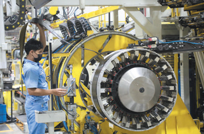 泰中罗勇工业园是中国首批境外经贸合作区之一,是共建“一带一路”产能合作的重要载体。图为泰籍员工在园区内通用橡胶(泰国)有限公司汽车轮胎生产线上工作。
