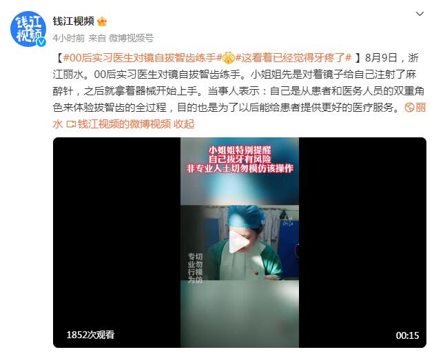 8月9日,浙江丽水。00后实习医生对镜自拔智齿练手。小姐姐先是对着镜子给自己注射了麻醉针,之后就拿着器械开始上手。当事人表示:自己是从患者和医务人员的双重角色来体验拔智齿的全过程,目的也是为了以后能给患者提供更好的医疗服务。