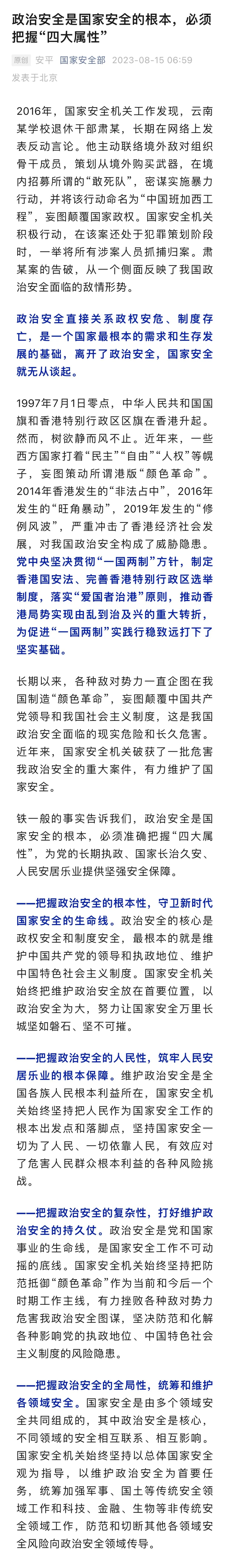 15日,国家安全部发文《政治安全是国家安全的根本,必须把握“四大属性”》,其中提及一个典型案例: