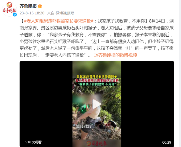 8月14日,湖南张家界。景区溪边男孩扔石头吓跑猴子,老人劝阻后,被孩子父母要求给自家孩子道歉,称:“我家孩子有我教育,不需要你”。拍摄者称,猴子本来靠的很近,小男孩往水里扔石头把猴子吓跑了,“边上一直都有很多人劝阻他,但小孩子扔得更起劲了,然后老人说了一句傻乎乎的,这孩子突然就‘哇’的一声哭了,孩子家长出现后,一定要老人向孩子道歉”。