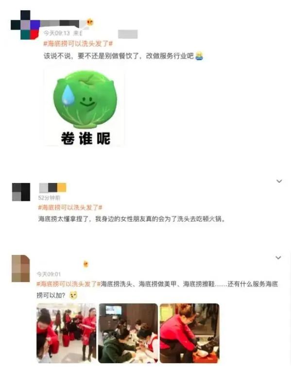 对此,网友调侃:“海底捞要不别干餐饮了,改行做服务吧”,“海底捞太懂拿捏了,我身边的女性朋友真的会为了洗头去吃顿火锅”,“海底捞的宗旨就是卷死同行”。