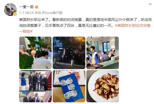 其中,认证为一坐一忘云南菜创始人的微博号7月7日发布消息介绍称,“美国财长耶伦来了。看新闻的时间推算,真的是落地中国风尘仆仆就来了,听店员说她很爱菌子,见手青就点了四份,真是无比魔幻的一天。”