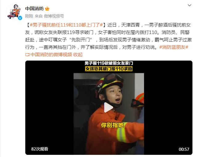 近日,天津西青,一男子醉酒后骚扰前女友,谎称女友失联报119寻求破门,女子害怕同时在屋内拨打110。消防员、民警赶赴,途中叮嘱女子“先别开门”,到场后发现男子情绪激动,霸气呵止男子过激行为,一直将其挡在门外,并了解实际情况后,对男子进行劝说。