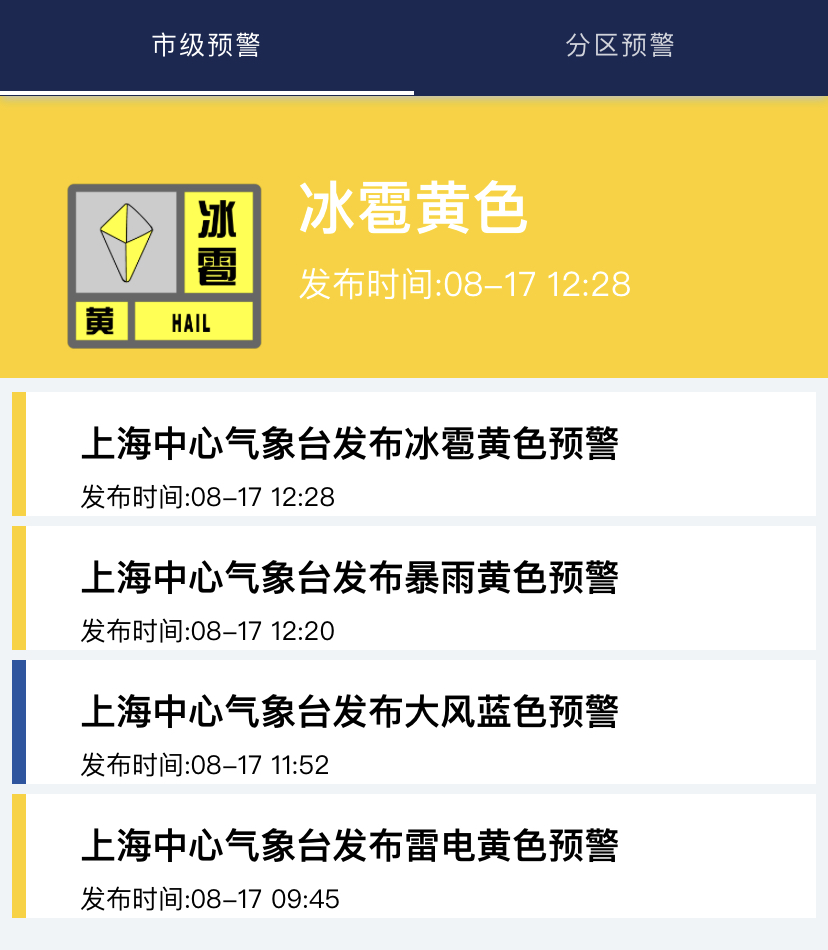 8月17日午间,冰雹、雷电、暴雨齐聚上海。目前,上海“三黄一蓝”四预警高挂,仍需加强防范。