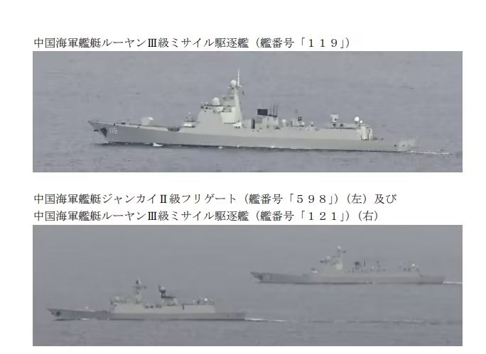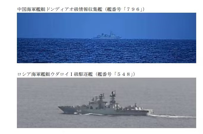 报道说,日本统合幕僚监部还声称,日本海上自卫队曾于周二上午在冲之鸟礁东北约280公里的太平洋海域发现11艘中俄舰艇,中方舰艇包括2艘驱逐舰、2艘护卫舰、1艘补给舰以及一艘侦察船,俄方舰艇包括“特里布茨海军上将”号及“潘捷列耶夫海军上将”号大型反潜舰以及两艘护卫舰及一艘补给舰。