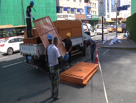 8月17日上午九点半,拆除单位哈四建在升平街路口将拆除位置做上围挡,保证行人的出行安全。