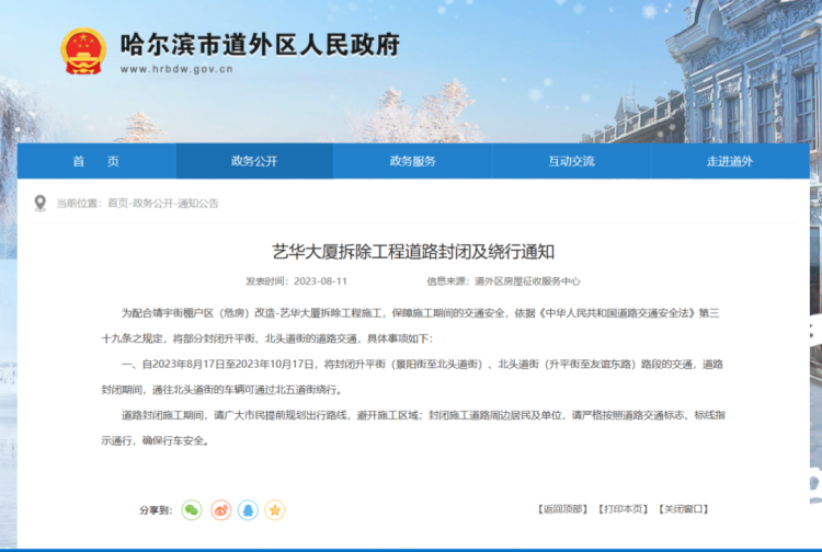 8月11日,哈尔滨市道外区人民政府发布艺华大厦拆除工程道路封闭及绕行通知: