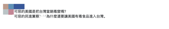 “可恶的美国是把台湾当销毒窟吗?可恶的民进党蔡当局为什么还要让美国有毒食品进入台湾。”
