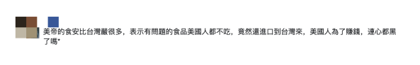 还有岛内网民批评称,“美国的食安比台湾严很多,表示有问题的食品美国人都不吃,竟然还进口到台湾来,美国人为了赚钱,连心都黑了吗”。