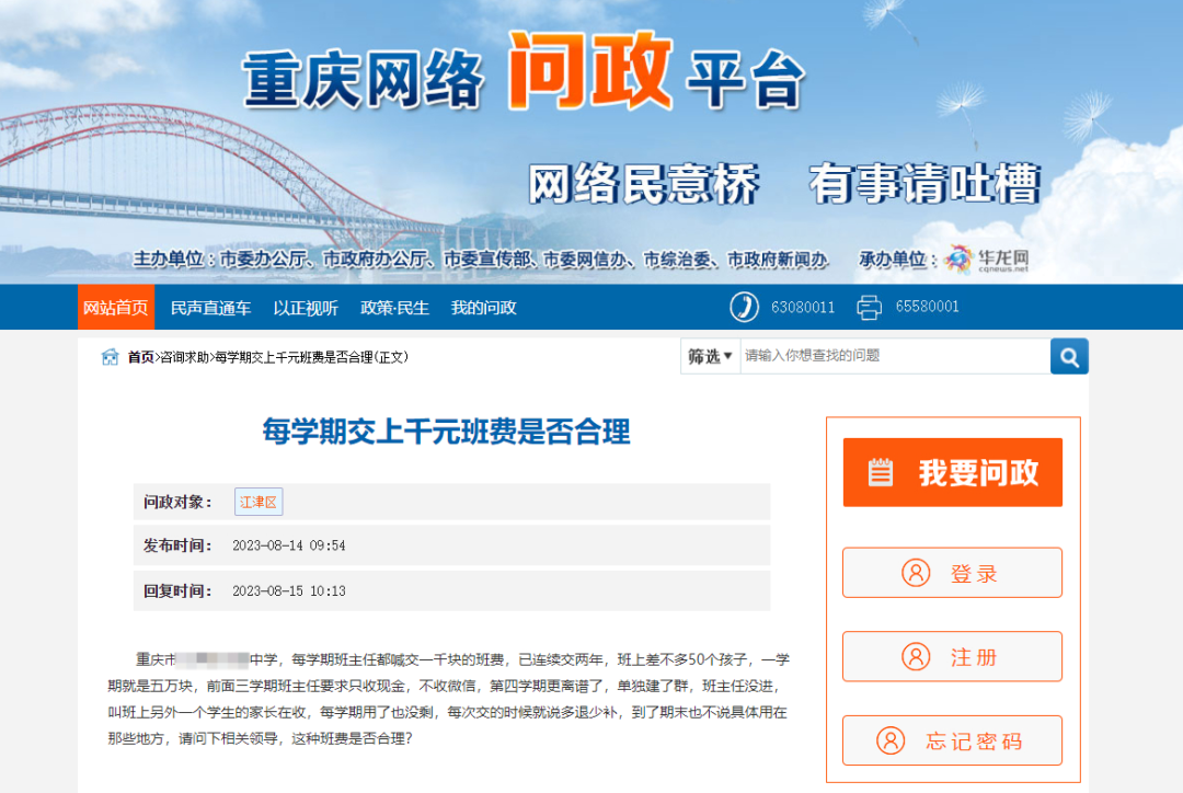 早前,重庆一市民在网络问政平台反映,江津区先锋中学某班主任每学期收取约5万元班费。