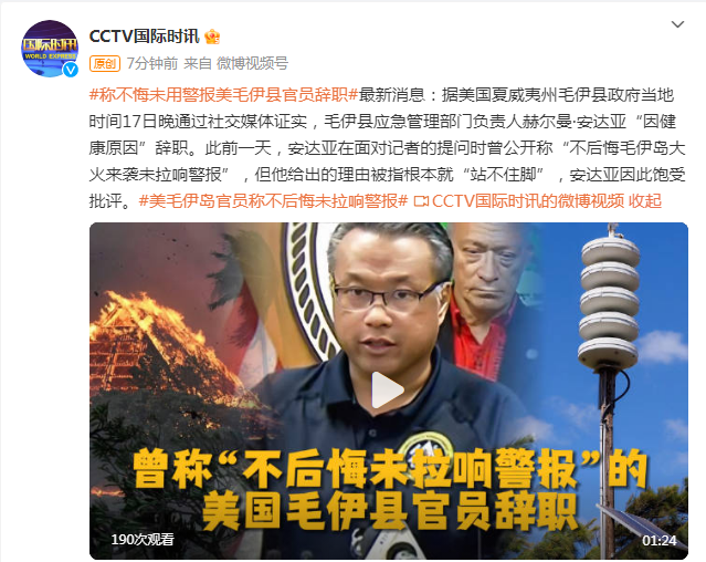 最新消息:据美国夏威夷州毛伊县政府当地时间17日晚通过社交媒体证实,毛伊县应急管理部门负责人赫尔曼·安达亚“因健康原因”辞职。此前一天,安达亚在面对记者的提问时曾公开称“不后悔毛伊岛大火来袭未拉响警报”,但他给出的理由被指根本就“站不住脚”,安达亚因此饱受批评。