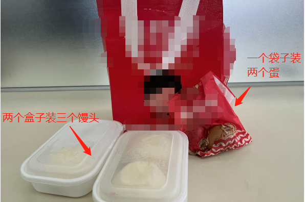 记者收餐后发现,3个馒头分装在2个餐盒中;2枚茶叶蛋则装进一个纸袋中。