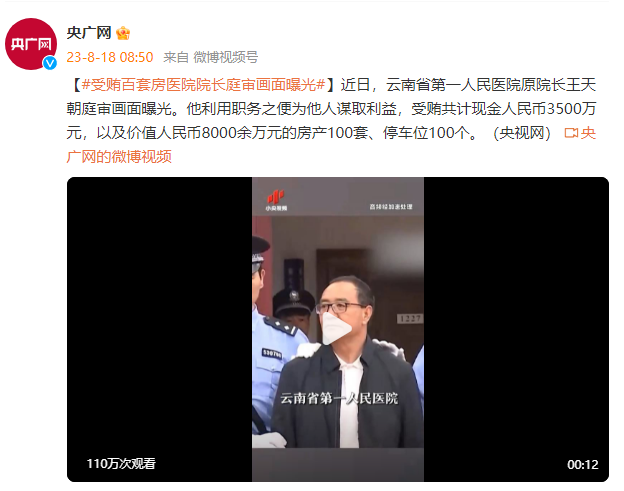 近日,云南省第一人民医院原院长王天朝庭审画面曝光。他利用职务之便为他人谋取利益,受贿共计现金人民币3500万元,以及价值人民币8000余万元的房产100套、停车位100个。(央视网)
