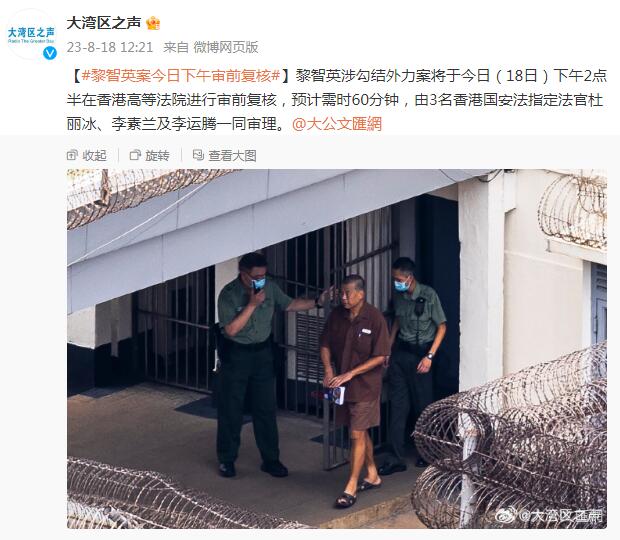 黎智英涉勾结外力案将于今日(18日)下午2点半在香港高等法院进行审前复核,预计需时60分钟,由3名香港国安法指定法官杜丽冰、李素兰及李运腾一同审理。