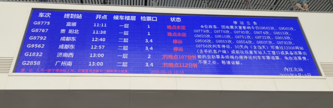 成都东、资中北、内江北、自贡等车站 及时通过站内大屏幕、广播、微博等载体滚动播报列车晚点信息,组织人员对站内设备、悬挂物进行巡视检查,确保设备设施安全可靠。同时,组织人员支援退票窗口,做好旅客安抚解释退票等工作,积极向旅客宣传网上退票方法,帮助旅客快速办理退票。